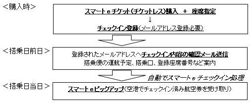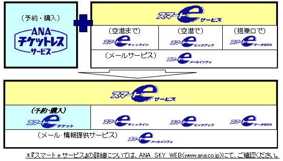 ANAでは、国内線における搭乗手続きを“簡単・便利”にご利用いただくことを目的として、2004年12月より『スマートeサービス』を展開してまいりましたが、さらに“簡単・便利”にご利用いただけるよう、2005年10月1日(土)より、『ANAチケットレスサービス』を『スマートeチケット』と名称変更するとともに、航空券予約から搭乗手続きまでの全てのサービスを統合して『スマートeサービス』として展開いたします。 また、2005年10月1日(土)からは、『スマートeチケット』にて航空券を購入・座席指定を行うと同時に、チェックイン登録が可能(*1)となります。チェックイン登録済みのお客様には、ご搭乗日前日に、自動的に登録されたメールアドレスにチェックイン内容の確認メールが届き、搭乗日当日、空港などに設置された自動チェックイン機で『スマートeピックアップ』でチケットを受け取るだけとなり、予約・購入・チェックインがますます便利になります。 ANAは、今後もお客様にとって“簡単・便利”なサービスを展開してまいります。どうぞご期待ください。 |