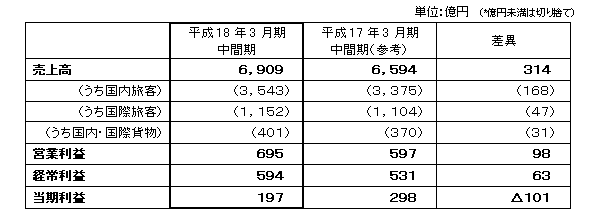 今年度上期の国内線は、2004年12月1日にリニューアルした羽田空港の新ターミナル効果や愛知万博(2005年3月25日〜9月25日開催)の影響を受け、旅客数は順調に推移致しました。国際線についても、ビジネス需要を中心に堅調に推移致しました。引き続き原油価格が高騰する中でも、着実な費用削減に努め、売上高・営業利益・経常利益は、過去最高を記録いたしました。一方、今中間期より、減損会計を適用していることから、当期利益については前年を下回る結果となりました。 2.国内線事業