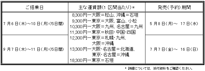 (1)設定期間 : 2006年7月1日(土)〜10日(月) および8月28日(月)〜9月30日(土)ご搭乗分 (2)対象路線 : ANA全路線 ※ 東京—石垣は片道運航のため、設定がございません。 (3)運賃額 : 会員ご本人様 往復10,000マイル 同行者(お一人様) 往復20,000円または24,000円 ※ 各路線の運賃額については別紙をご参照下さい。 (4)主な適用条件 :