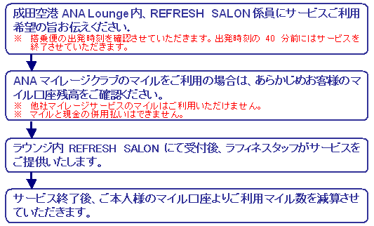 事前予約は受け付けておりません。搭乗当日、直接ラウンジ内REFRESH SALONにてご利用希望の旨お申し出ください。 |