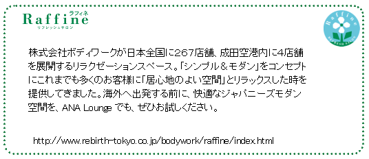 ANAは、8月31日(木)より、成田空港第1旅客ターミナル国際線出発エリアのANA Loungeで、搭乗前にご利用いただける各種リラクゼーションサービスを開始いたします。海外旅行出発前のひとときにぜひお試しください。 本サービスは成田空港発国際線にて出発される際、出国審査後ANA Loungeをご利用のお客様であればどなたでもご利用いただけます。また、ラウンジ内施設において、リフレクソロジー、フェイスセラピー、ボディケア、ハンドリフレクソロジー、の4種類のサービスを、既に成田空港内に4店舗を展開する Raffine(ラフィネ)(株式会社ボディワーク)より提供いたします。 ANA Lounge 入室後、シャワーブース近くに設置したREFRESH SALON 係員にご希望のサービスを伝えるのみでサービスを受けられ、お支払いは現金(日本円・米ドル)やANAマイレージクラブ(AMC)のマイルでもご利用いただけます。ご同行の方へのマイル譲渡によるご利用も可能です。 ますます便利になるANAに、どうぞご期待ください。 |