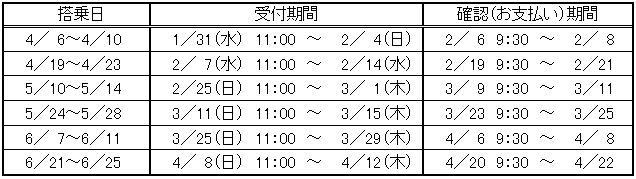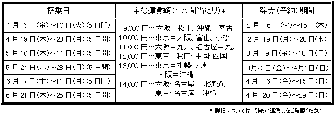 | ANAは、本日、1月24日(水)に、2007年4月〜6月搭乗分の「超割」運賃を決定し、国土交通省に届出を行いました。 「超割」は、4月から6月までの期間で5日間型を6回、計30日間設定いたします。 ANAでは、ホームページにて「超割」の発売に先立ち、事前にご希望便をお申し込みいただける『先行受付サービス』を実施しております。 ぜひANAの「超割」で旅行にお出かけください。 なお、2007年7月以降の搭乗分は別途発表いたします。 |