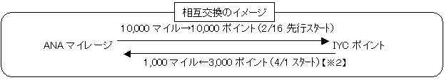 2007年2月16日(金)より、ANAマイレージクラブ(以下AMC)のポイントをアイワイカード(以下IYC)のポイントへの交換を先行してスタートさせ、2007年4月1日(日)より、両社ポイントプログラムの相互交換サービスを開始します。 AMC会員のお客様は、10,000マイルを10,000ポイント(10,000円相当)【※1】に換えることが、IYC会員のお客様は、3,000ポイントを1,000マイルに換えることが可能になります。 なお、4月はポイント交換開始キャンペーン期間として、3,000ポイント⇒1,000マイル交換時にボーナスマイルとしてさらに500マイルをプレゼントします。 【※1】 交換にあたっては上限の設定があります。 |