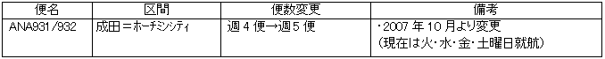 ANAでは、2007年度の国際線路線便数計画の一部変更を決定し、本日、国土交通省に申請いたしました。 今回の変更により、成田=ホーチミンシティが週5便の運航(火・水・金・土・日曜日就航)となり、成長著しいベトナムへのご出張、ご旅行がさらに一層便利になります。 成田=ムンバイ線は、デイリー運航を予定しておりましたが、週6便(水曜日を除き毎日就航)の就航に変更します。当路線には、ANAとして初めて全席ビジネスクラス仕様の「ANA BusinessJet」(ボーイング737-700ER型機)を投入します。 |