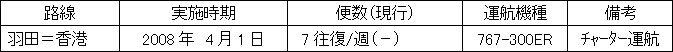 拡充された羽田国際チャーター便運航可能時間帯を活用し、2008年4月から羽田=香港線を毎日チャーター運航いたします。また、2008年8月開催の「北京オリンピック」開催を契機に環境条件が整い次第、羽田=北京(南苑空港)路線へチャーター便の運航を計画します。 |