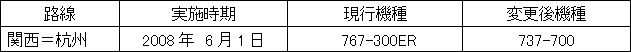 2008年3月から、関西=青島線を2008年6月から関西=大連線を増便し、それぞれデイリー運航とします。また関西=杭州線に最新鋭のボーイング737-700型機を投入します。 |