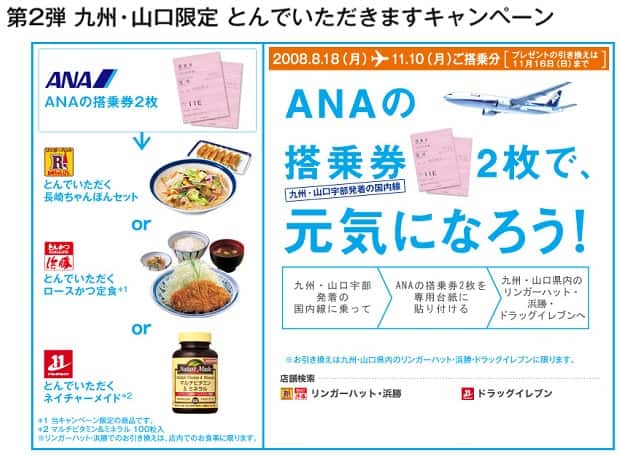 また、現在ANAでは、「第2弾九州・山口限定 とんでいただきますキャンペーン」として、ANAの対象路線の搭乗券2枚(2008年11月10日ご搭乗分まで)を引き換え専用用紙に貼って店舗までお持ちいただくと、たとえば、ドラッグイレブンでは商品(ネイチャーメイド)をプレゼントするお得なキャンペーンを実施しております。(*リンガーハット・浜勝も対象店舗です。)