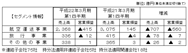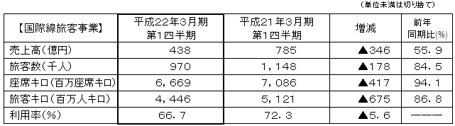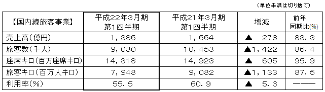 この施策により、ゴールデンウイーク期間中の旅客数は前年同期を上回りましたが、新型インフルエンザの流行に伴い、企業での出張制限や旅行のキャンセル等が継続しました。さらに、ビジネスクラスの利用減少、燃油特別付加運賃の値下げ等により、単価が下落しました。 |