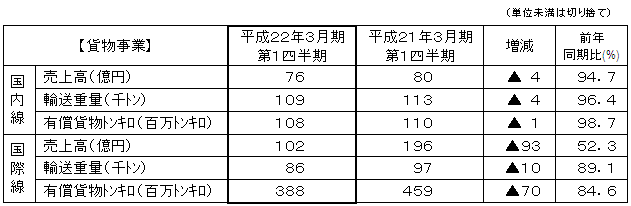 国際線は、世界的な景気後退の影響を受けて需要が伸び悩み、輸送重量は前年を下回りましたが、本年3月以降徐々に回復の動きを見せており、内需拡大策を進めている中国向け貨物は前年同期並みの輸送実績となりました。 |