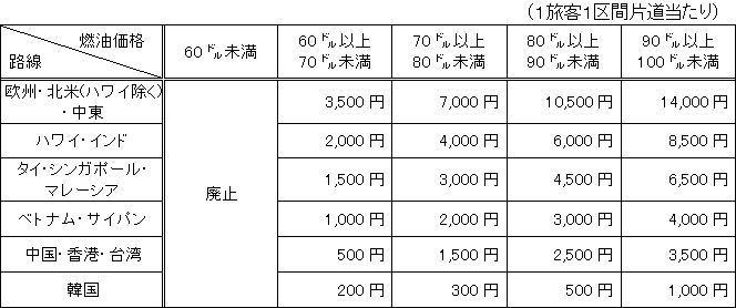 | ANAグループ(※)は、本日2009年8月18日(火)、国際線旅客における「燃油特別付加運賃(いわゆる燃油サーチャージ)」の再設定を国土交通省に申請いたしました。 燃油特別付加運賃につきましては、航空燃料市場価格の下落に伴い2009年7月1日発券分より廃止いたしましたが、その後、航空燃料市場価格が再び上昇している状況に鑑み、今般、10月1日以降の発券分について再設定することといたしました。 なお、従来、燃油特別付加運賃額の見直しを3カ月ごとに行ってまいりましたが、今般の再設定を機に、航空燃料市場価格の動向をよりタイムリーに反映させるため、申請時点における直近2カ月の航空燃料市場価格の平均に基づいて2カ月ごとに見直すことといたします。 今般申請いたしました2009年10月1日〜11月30日ご購入分の燃油特別付加運賃については、2009年6月から7月のシンガポールケロシン市場価格の2カ月平均である1バレルあたり74.5米ドルを基準といたしました。何卒、ご理解のほどよろしくお願い申し上げます。 (※)ANA、AJX(エアージャパン) |