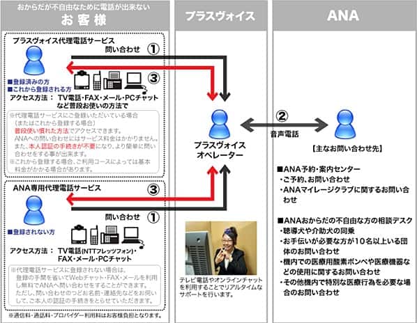ANAでは、2010年2月1日(月)より、福祉ソリューション事業を手がける株式会社プラスヴォイス(宮城県仙台市)の協力のもと、聴覚や言語に障がいのあるお客様向けにANA専用の「代理電話サービス」(※1)を開始致します。これまでは、ANAのご利用やお問い合わせの際、国内線の予約ファックスサービスやインターネットなどでのお手続きに限定されておりましたが、このたび同サービスをご利用いただくことで、ご搭乗などに際し、各種問い合わせやご希望などの意思疎通を、よりスムーズに対応していくことが可能となります。 また、今回のサービス開始に先立って、2010年1月5日(火)よりANAホームページ(「ANA SKY WEB」)のサイト内のコンテンツ「おからだの不自由なかたへの空の旅へのお手伝い」を全面リニューアルします。 今後もANAはバリアフリーの推進を含む、「ユニバーサルサービス」(※2)の実現に向けて、より多くのお客様が安心して快適に空の旅をお楽しみいただけるよう、これからも各種サービスを拡充していきます。