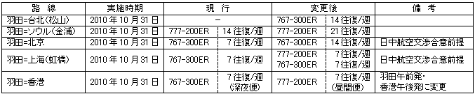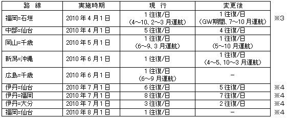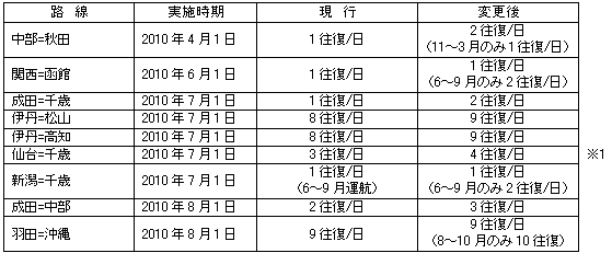8月1日(日)から10月31日(日)の間、羽田=沖縄線を増便いたします。また、増枠に伴う羽田発着枠配分時点(現時点では2011年4月を想定)において、羽田=徳島線の再開を計画いたします。 |