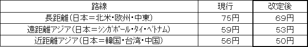 | ANAグループは、本日2010年1月13日(水)、国際線貨物における「燃油特別付加運賃」(いわゆる燃油サーチャージ)の運賃額改定を国土交通省に申請いたしました。 当社グループでは、昨年4月から燃油特別付加運賃額を、航空燃料市況価格に基づき、毎月見直すこととしておりますが、2009年12月1日から2009年12月31日の同価格の1カ月平均は1バレル当たり83.20ドルに達しておりますので改定することといたしました。 当社グループは、従来同様、様々な費用削減努力や増収努力を講じておりますが、こうした状況を踏まえ、国際線貨物ご利用のお客様に、引き続きご負担をお願いせざるを得ないと判断し、燃油特別付加運賃額の改定を行うことといたしました。何卒、ご理解のほど宜しくお願い申し上げます。 |
