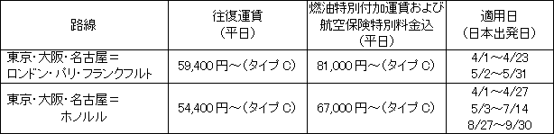 運賃や適用条件は、予告なしに変更される場合があります。また、国際運送約款に準じ、各種航空券には、旅行開始日に設定され、かつ航空券の発行日に有効な運賃が適用されます。一旦航空券をご購入いただいた後、運賃が変更となった場合でも、差額の調整(追徴・払い戻し)は行いません。 |