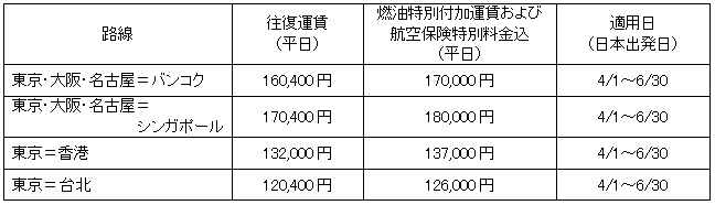 平日運賃: 日本発北米行き 火〜金曜 北米発日本行き 日〜木曜 日本発アジア行き 火〜金曜 アジア発日本行き 月〜木曜 |
