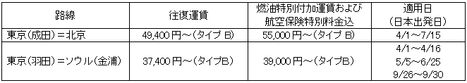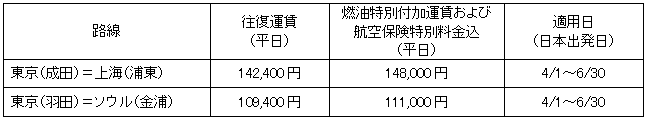 中国・韓国行きは、従来の「スーパーエコ割」に替わり、ご出発3日前までのご予約とご購入が条件の「スーパーエコ割3」を設定します。土曜日の夜を目的地(現地)で過ごす日程*1であれば、大変おトクな運賃設定となります。また、早めのご予約とご購入*1でおトクになる「エコ割7」も引き続き設定します。いずれも空席状況連動型運賃*2ですので、ご予約時点の空席予測数が多いほど、よりおトクな価格でご購入いただけます。