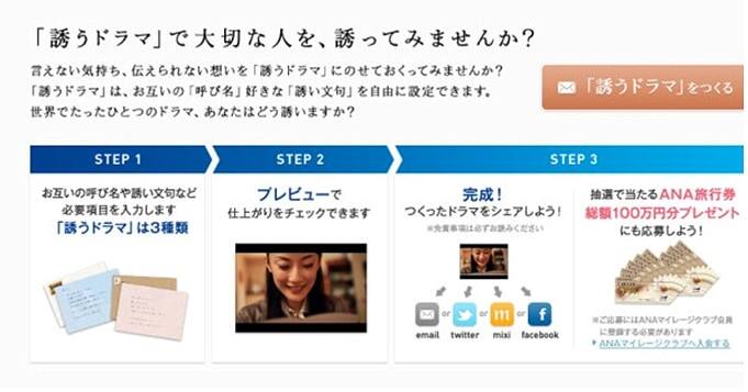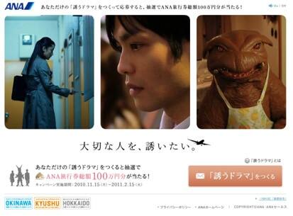 | ANAは、2010年11月15日(月)より、「誘うドラマ」をつくって応募すると、抽選でANA旅行券が当たる「『誘うドラマ』をつくってANA旅行券を当てよう!」キャンペーンを実施しております。 「誘う」をキーワードとした沖縄・北海道・九州旅行キャンペーンと連動し、パートナーをそれぞれの旅に誘う、世界でたったひとつのドラマをおつくりいただけます。 さらに、ドラマをつくって応募いただくと、抽選で総額100万円分(10名様に10万円分)のANA旅行券が当たります。 また、11月29日(月)からは、首都圏JRトレインチャンネルなどにおいてCMを展開し、キャンペーンを盛り上げていく予定です。 この秋冬は、ぜひ “大切な人を誘って” ご旅行にお出かけください! |
