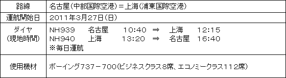 ANAは、一時運航を休止しておりました名古屋(中部)=上海(浦東)線を、2011年サマーダイヤ〔2011年3月27日(日)〜同年10月29日(土)〕期間に運航再開いたします。 |