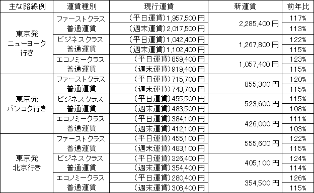 ANAグループ(*1)では、IATA(国際航空運送協会)運賃調整会議(*2)にて採択された決議に基づき、本日12月27日(月)、日本発(*3)北米・ハワイ・アジア・中東・アフリカ行きに適用となる国際航空運賃の改定を国土交通省に申請いたしました。 (*1)ANA、AJX(エアージャパン) (*2)日本=北米・ハワイ・アジア・中東・アフリカ間に適用になるIATA運賃につきましては、2011年度より、従来のIATA運賃調整会議による決定方式から、フレックスフェア方式に変更となっています。 (*3)欧州方面は後日申請いたします。 |