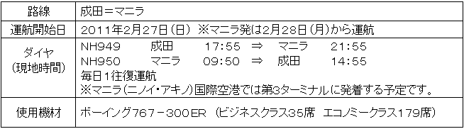 ANAは、2011年2月27日(日)より、成田=マニラ線の運航を開始いたします。 フィリピンの首都マニラは、東南アジア有数の旅客流動を誇る都市であり、日本とフィリピンを結ぶ二国間のご利用のみならず、成田空港での接続で、ご利用いただける北米との接続需要も大きく見込めます。日本からのスターアライアンスネットワークにマニラが加わること、また、日本を経由地とするANAのコネクションネットワークを短時間の乗り継ぎでご提供することにより、お客様の選択肢の拡大、利便性向上にも寄与いたします。