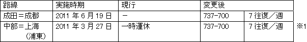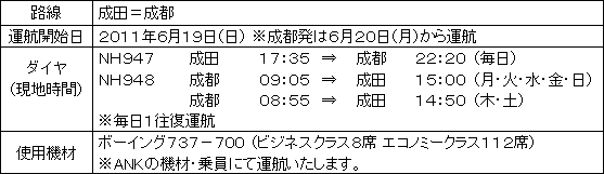 2011年6月から成田=成都線の開設を計画します。ANAは現在中国9都市10空港に定期旅客便を運航していますが、いずれも沿岸部の都市であり、内陸部へは初就航となります。成都は、成渝経済区(※)として中国政府による重点開発区に指定され、周辺地域に人口1億人の経済圏を持つ都市で、中長期的に経済発展および流動増加が見込まれます。また観光面でも、九寨溝や黄龍といった世界遺産、日本でもおなじみの四川料理等、魅力あるポイントに恵まれています。これまでは北京や上海での乗り継ぎが必要でしたが、直行便により中国内陸部への移動の利便性向上を図ります。 (※)成渝経済区:重慶市と四川省成都市の2都市を中心とした経済区。成は成都、渝は重慶を示す。 ■運航に関する詳細は次のとおりです。(これらは関係当局の認可を前提としております。)