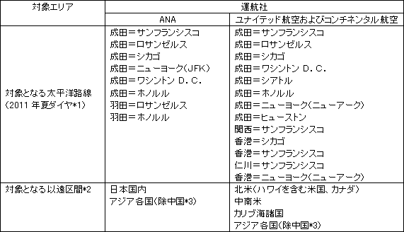 日米当局によるATI認可を受けて、2011年4月1日より太平洋路線におけるユナイテッド航空およびコンチネンタル航空との共同事業(JV)を開始いたします。3社はこれまでも、スターアライアンスパートナーとして、コードシェアやマイル提携、出発ターミナルの共通化等を実施してきました。JV実施後は各社の国内・国際のネットワークを統合し、運賃を共通にして、相互にダイヤ調整を行います。その結果、各社の個性豊かなサービスはそのままに、搭乗便をより豊富な組み合わせ中から便利にご利用いただけるようになります。また、JVの対象路線においては、ご加入いただいているマイレージプログラムの積算条件が、ご利用便の運航会社を問わず、適用されます。尚、運賃の詳細については別途お知らせいたします。 - JVの概要 -