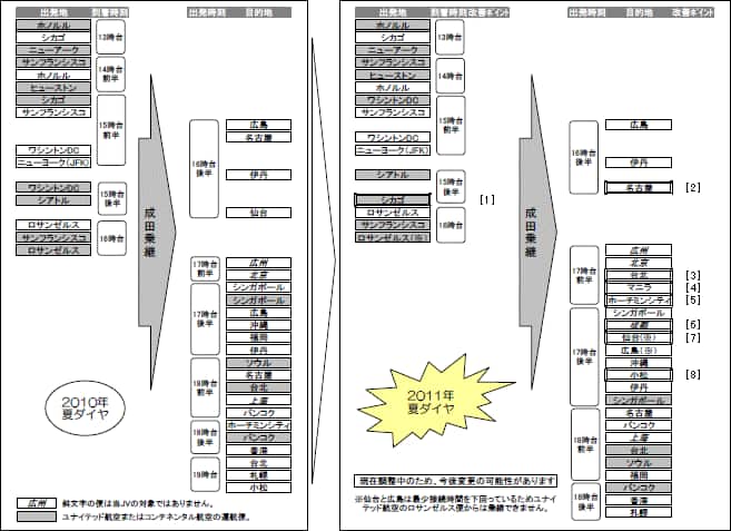改善ポイント: [1]UAのシカゴ線到着の55分遅発化により(15:00⇒15:55)、当該便からの内際全ての乗り継ぎ先が3時間以内となり、 乗り継ぎ先は10路線13便(8路線11便*)から19路線22便(15路線18便*)に拡大。 *本JV対象外便を除いた場合 (うち、新規開設によるものは2路線、接続便のダイヤ改善によるものが3路線) [2]夕方に2便ある名古屋便のうち、16時台の便を25分遅発化し、より多くの北米便との接続を確保。 [3]台北線の大幅早発化により、北米線との乗り継ぎ時間が飛躍的に短縮。 [4]本年2月27日新規開設のマニラ線において、冬ダイヤから30分早発化し、更に乗り継ぎ時間を短縮。 [5]ホーチミンシティ線を大幅早発化 し、北米との乗り継ぎ時間を飛躍的に短縮。 [6]成都線の新規就航による地点追加。 [7]仙台線の45分遅発化により、当社運航のロサンゼルス線との接続を確保。 [8]小松線の95分早発化により、乗り継ぎ時間の大幅短縮。 |