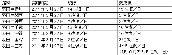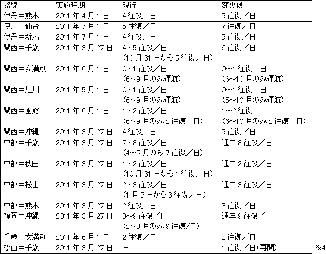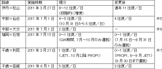 競合他社の路線便数展開、2011年3月の九州新幹線全通等、激変する競争環境を考慮し、2010年度に実施した増便を2011年度にも継続しながら、大阪(伊丹・関西)、中部発着路線の増便、季節運航(増便)期間の延長と、松山=千歳線の再開を行います。また、山陽・九州新幹線と競合となる伊丹=熊本線については増便を行い、航空の利便性向上を図ります。 また、北海道内ネットワークについては、2010年7月より千歳発着に集約(ハブ化)し、道外との乗り継ぎ需要の増加が図られていますが、その後の需給環境や季節波動等を踏まえ、2011年6月より便数・機材・ダイヤ・運航時期の最適化を行い、利用率の向上と乗継利便性の向上を図ります。 |