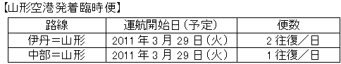 | 1.山形空港への臨時便の設定について ANAグループは震災以降、公共交通機関として、被災地域の交通インフラの確保の観点から、福島空港発着の臨時便の設定を行っておりますが、甚大な被害を受けた仙台空港については、復旧は進んでいるものの、定期便再開の目処は立っておりません。 今般、仙台ならびに被災された東北地方への交通アクセスの一層の充実を図るため、現在就航していない山形空港の運航体制を早期に構築し、以下の通り臨時便を設定します。 |