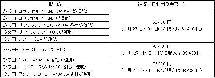 日本発 土曜日・月曜日、米国発 金曜日をご利用の場合は、片道あたり9,000円が加算されます。 |