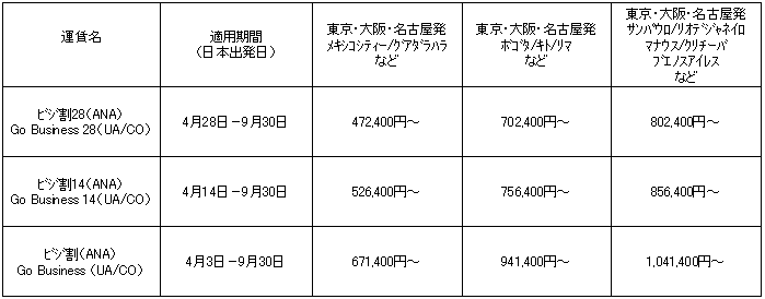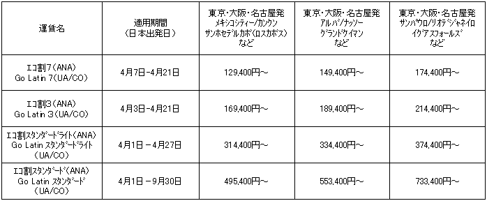 全日本空輸株式会社(本社:東京、代表取締役社長:伊東信一郎、以下ANA)、ユナイテッド航空ならびにコンチネンタル航空(本社:シカゴ、社長兼CEOジェフ・スマイゼック、以下UAならびにCO)では、4月1日以降ご搭乗分の、メキシコ・カリブ諸島・中南米行きの共同事業の運賃を、明日3月31日*1より発売いたします。 4月1日以降に日本をご出発されるお客様を対象とした新運賃は、ANA/UA/CO 3社の正規割引運賃である各種「エコ割/ビジ割」(ANA)、各種「Go Latin/Go Business」(UA/CO)の運賃額ならびに適用条件が統一されており、メキシコ・カリブ諸島・中南米・へ渡航されるお客様にとって大変に便利にご利用いただけます。