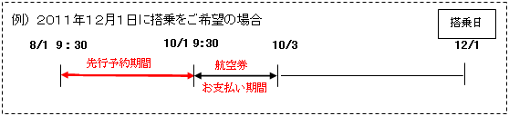 (1)対象期間 : ・「旅割A」、「旅割B」 2011年10月1日(土)〜2011年12月28日(水) ・「スーパー旅割」 2011年10月1日(土)〜2011年12月22日(木) (2)受付期間 : 2011年8月1日(月)9:30から搭乗日の2ヶ月前の前日まで ※搭乗日の2ヶ月前以降は通常通りの予約・発売となります。 (3)受付箇所 : ANAホームページおよび主な旅行会社(※一部の旅行会社ではお取扱できません) (4)お支払い期間 : 搭乗2ヶ月前の同一日9:30から翌々日までの3日間 ※「先行予約」受付後、お支払いまでの間は何回でも変更が可能です。 (5)その他 :