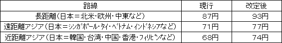 | ANAグループは、本日2011年1月14日(金)、国際線貨物における「燃油特別付加運賃」(いわゆる燃油サーチャージ)の運賃額改定を国土交通省に申請いたしました。 当社グループでは、2009年4月から燃油特別付加運賃額を、航空燃料市況価格に基づき、毎月見直すこととしておりますが、2010年12月1日(水)から2010年12月31日(金)の同価格の1カ月平均は1バレル当たり103.53米ドルに達しておりますので改定することといたしました。 当社グループは、従来同様、様々な費用削減努力や増収努力を講じておりますが、こうした状況を踏まえ、国際線貨物ご利用のお客様に、引き続きご負担をお願いせざるを得ないと判断し、燃油特別付加運賃額の改定を行うことといたしました。何卒、ご理解のほど宜しくお願い申し上げます。 |