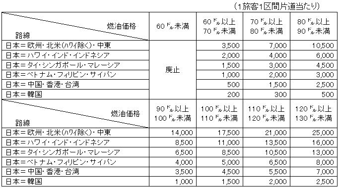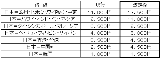 2.運賃額 : 次の運賃を日本発の国際線区間に適用(1旅客1区間片道あたり)![]() (*1):日本=中国路線については、中国政府へ3,500円で申請中であり、2011年2月23日現在、2,500円を適用しております。 ※関係国政府の認可等の状況により、適用額が予告なく変更となる場合があります。 |