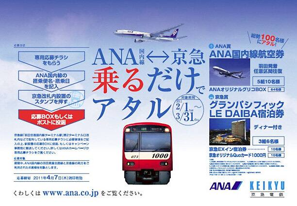 全日本空輸株式会社(本社:東京都港区、代表取締役社長:伊東信一郎、以下「ANA」)と京浜急行電鉄株式会社(本社:東京都港区、取締役社長:石渡恒夫、以下「京急」)は共同で、2011年2月1日(火)〜3月31日(木)まで「ANA⇔京急 乗るだけでアタル」キャンペーンを実施します。 これは、専用応募チラシに、ANA国内線の搭乗便名・搭乗日の記入をしていただき京急線羽田空港国内線ターミナル駅改札内に設置するスタンプを押印して、応募BOXに投函または郵送で応募していただきますと、100名様に豪華賞品があたるものです。 詳細は別紙をご覧ください。 |