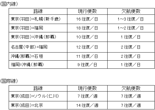 ANAグループでは、東日本大震災後の需要動向に対応し、東北地方への臨時便の設定や機材の小型化、一部国内路線の欠航を実施して参りましたが、本日4月14日(木)、4月18日(月)以降の国内線および国際線の定期便の一部を欠航させていただくことを決定いたしました。欠航の対象便をご予約のお客様には大変ご迷惑をお掛けいたしますが、何卒ご理解を御願い致します。 |