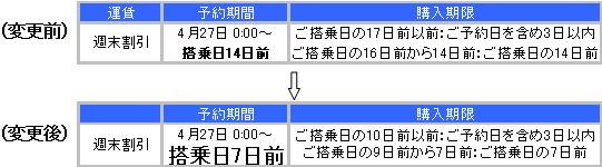 ANAは本日、2011年5月14日(土)〜6月26日(日)の土曜日・日曜日を対象とした期間限定運賃「週末割引」の予約・購入期限変更について、国土交通省に届出を行いました。 概要は、以下の通りです。 |