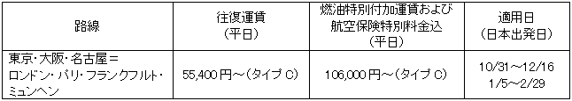 | ANAは、2011年度下期(2011年10月1日(土)〜2012年3月31日(土)日本出発分)の欧州・中東・アフリカ・南米(欧州経由)行きエコノミークラス割引運賃「エコ割」、およびビジネスクラス割引運賃「ビジ割」を国土交通省に申請いたしました*。 2011年7月12日(火)より販売開始予定です。 *運賃によっては一部設定のない路線もあります。 ◆ この度設定した各運賃の概要は以下のとおりです。 |