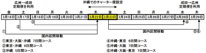 3月22日(木)は広州発成田経由にて沖縄入りするツアー(①〜③)の復路便として、3月23日(金)は広州発那覇直行便のツアー(④〜⑥)の往路便としてチャーター運航を実施。 |