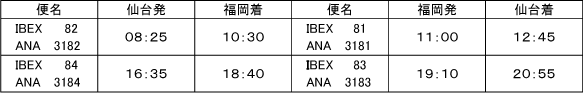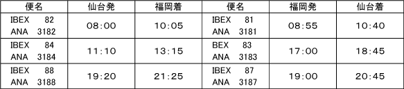 IBEXとANAの提携がさらにひろがります 〜 IBEX初乗り入れの福岡=宮崎線・大阪(伊丹)=宮崎線・名古屋(中部)=福岡線、 および大阪(伊丹)=福岡線(増便)、仙台=福岡線(増便)でコードシェアを拡大 〜 |