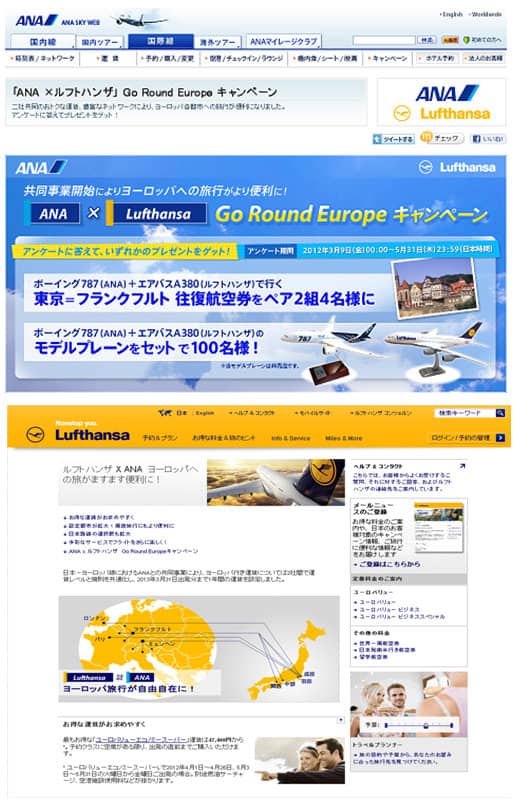 ANA・ルフトハンザの共同事業により、「充実したネットワーク」、よりお得になった「共同運賃」、B787やA380など「話題のプロダクト」についてご覧いただけるウェブサイトを共同で開設いたします。さらに、アンケートに答えて、素敵なプレゼントが当たる「ANA X ルフトハンザ GO ROUND EUROPE」キャンペーンも実施いたします。