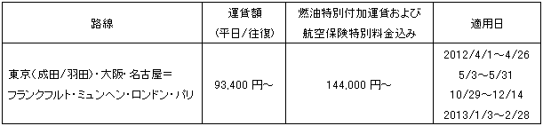 平日運賃 日本発欧州行き:月〜金曜、欧州発日本行き:日〜木曜 |