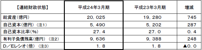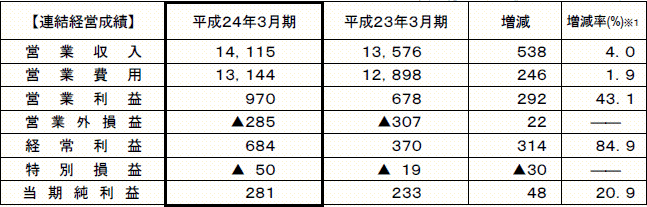| これらの結果、平成24年3月期の連結経営成績は営業収入が14,115億円に増収、営業利益は過去最高の970億円、経常利益においても過去最高の684億円となり、当期純利益は281億円となりました。なお、1株あたりの配当金につきましては、4円を予定しております。 |