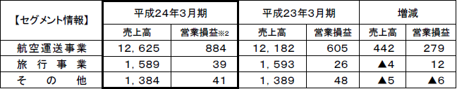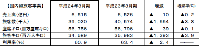 期初においては震災影響により需要が減退しましたが、ビジネス需要は6月には前年同期並みの水準に回復し、プレジャー需要についても新運賃「週末割引」の設定、「旅割」・「スーパー旅割」の値下げ、旧盆期間への「旅割」の設定拡大等の需要喚起策が奏功し、当期末には概ね震災影響は解消しました。 |
