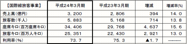 | 結果として、国際線旅客収入は394億円の増収(前期比14.0%増)となりました。 |