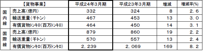 国内線貨物は、震災影響のもと北海道路線を中心とした陸送からの代替需要が発生したことに加え、11月からのボーイング787型機の国内線投入による供給量の拡大効果等もあり、輸送重量が前期を上回りました。 |