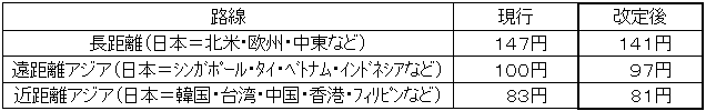 | ANAグループは、本日2012年5月22日(火)、国際線貨物における「燃油特別付加運賃」(いわゆる燃油サーチャージ)の運賃額改定を国土交通省に申請いたしました。 当社グループでは、2009年4月から燃油特別付加運賃額を、航空燃料市況価格に基づき、毎月見直すこととしておりますが、2012年4月1日(日)から2012年4月30日(月)の同価格の1カ月平均は1バレル当たり133.31米ドルとなったため、改定することといたしました(現行から1テーブルの値下げ)。何卒、ご理解のほど宜しくお願い申し上げます。 |