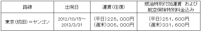 平日運賃 : 日本発ミャンマー行き 月〜金曜 ミャンマー発日本行き 日〜木曜 |