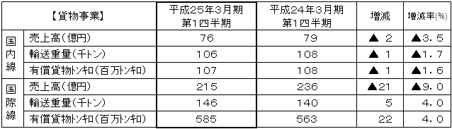 | 結果として、国内線貨物収入は2億円の減収(前年同期比3.5%減)、国際線貨物収入は21億円の減収(前年同期比9.0%減)となりました。 |