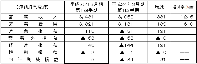 | これらの結果、第1四半期の連結経営成績は営業収入が3,431億円、営業利益が110億円、経常利益は46億円となり、四半期純利益は6億円の増収増益となりました。 |